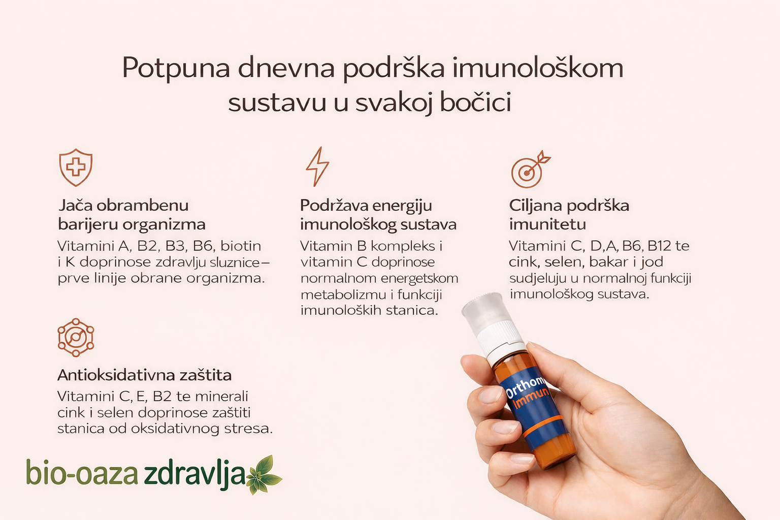 Orthomol Immun kombinira više od 25 mikronutrijenata, uključujući vitamin C, vitamin D, cink i selen, koji imaju ulogu kada je organizam pod većim opterećenjem – primjerice kod čestih infekcija, umora ili tijekom oporavka.